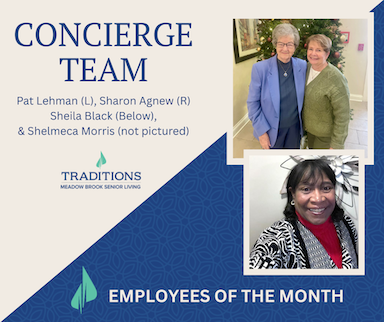 This month, we are excited to celebrate the entire concierge team at Meadow Brook Senior Living as our Featured Employees of the Month!Congratulations to Pat Lehman, Sharon Agnew, Sheila Black,… Read full post