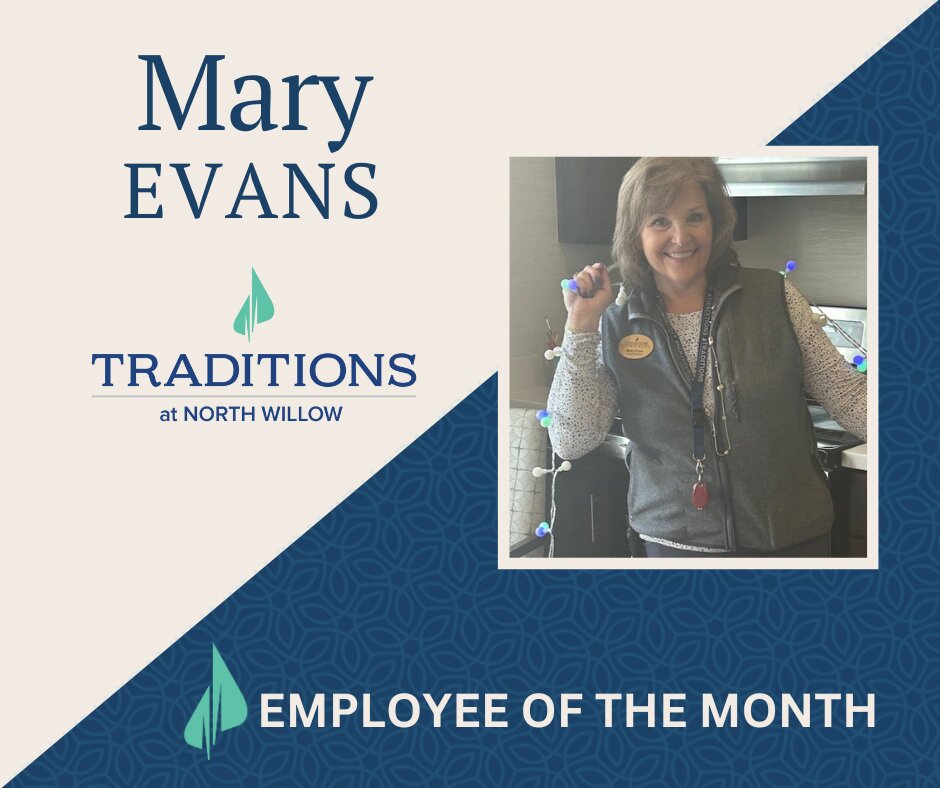 FEATURED EMPLOYEE OF THE MONTH Mary Evans | Program Director Traditions at North Willow Meet Mary Evans, Traditions’ Featured Employee of the Month! Mary was born and raised in Marion,… Read full post