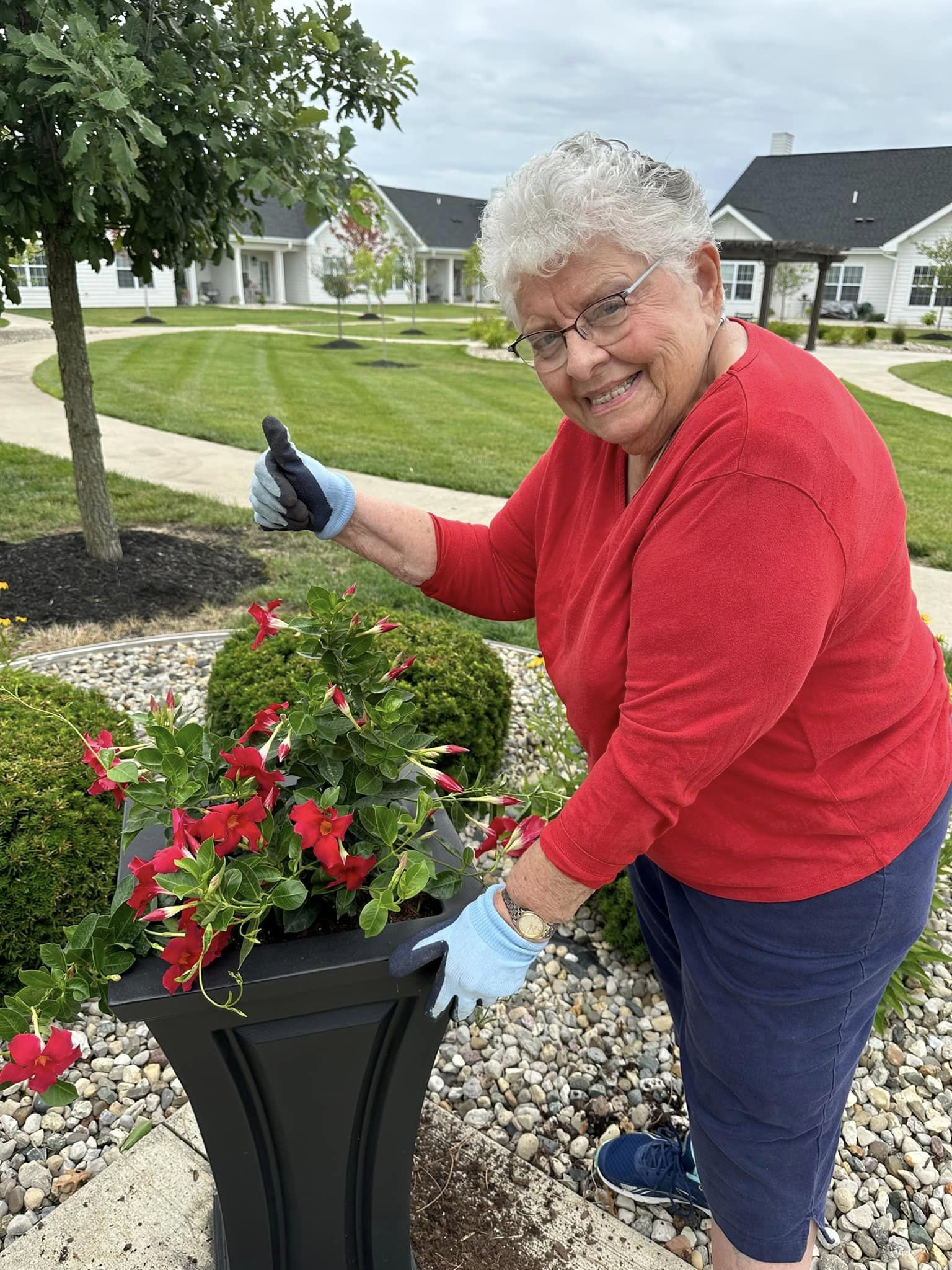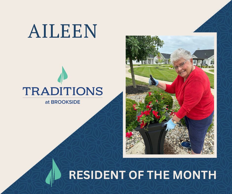 “Aileen was nominated for Traditions’ Resident of the Month by multiple managers,” said Kara Cope, Community Relations Director. “She has lived at Traditions at Brookside since we opened. She is active, positive, sweet, and filled with complete joy. Aileen makes our community a better place; we are so grateful to have her. She serves as our New Resident Ambassador, welcoming new residents and making them feel at home. In the spring and summer, when you come and visit, you will see our beautiful garden. Aileen is integral in its beauty!”