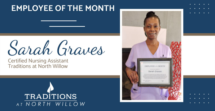 Allison Brown, Tradition at North Willow’s Community Relations Director said, “It was an easy decision to honor Sarah as our amazing Employee of the Month! Sarah has been with us since we opened 5 years ago! Sarah is constantly going above and beyond to care for and get to know each of our residents and their family members. Thank you for everything you do, Sarah. North Willow is lucky to have you!!”